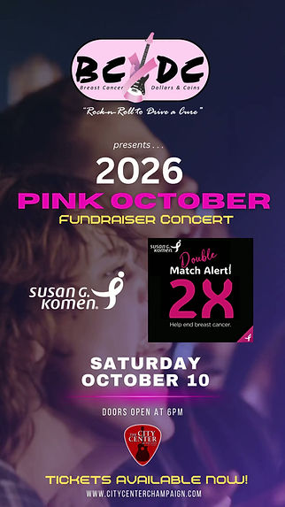 BC/DC (Breast Cancer - Dollars & Coins) is a music-themed 501c3 Not-for Profit Organization that produces live classic rock-n-roll concerts held in premier historic venues to drive donations for breast cancer research. In September 2023, BC/DC in cooperation with the Classic Rock band - Head First - held a successful live rock-n-roll concert and fundraising event - generating $10,450 donations towards cancer research - $15,000 at the historic Virginia Theatre in October 2024 and $62,518 at the City Center in Champaign, IL October 2025. ​​